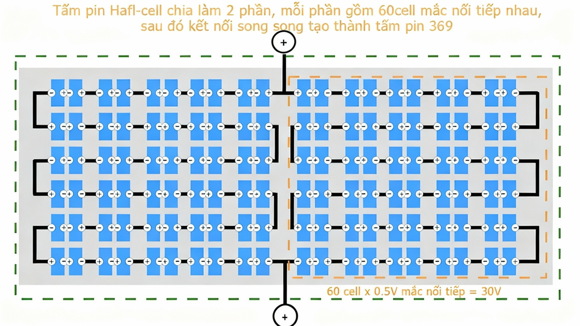Half-Cut Cell là một cải tiến quan trọng trên các tấm pin Mono-crystalline hiện đại. Thay vì sử dụng 60 hoặc 72 cell pin nguyên vẹn, công nghệ này cắt đôi các cell pin bằng laser để tạo ra số lượng cell gấp đôi (ví dụ: từ 60 cell thành 120 half-cell).