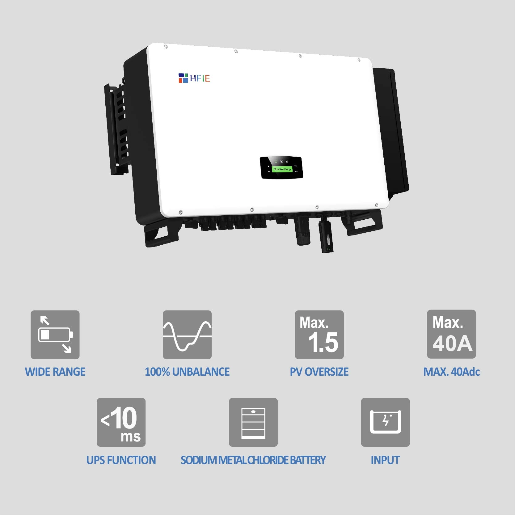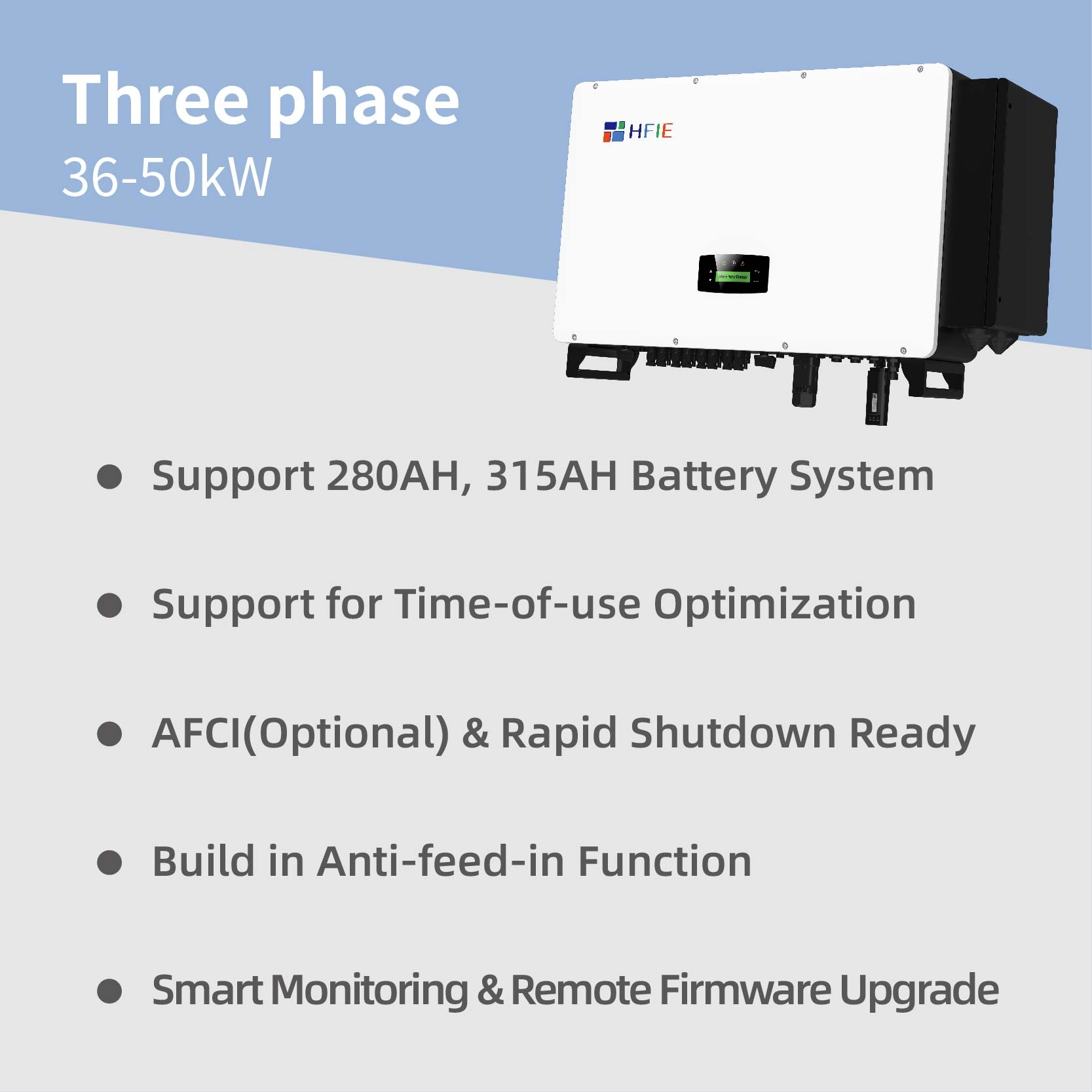 Biến tần 3 pha hybrid này có 3 mức công suất: 36 kW, 40 kW, 50 kW, phù hợp nhà xưởng tiêu thụ 10,000-20,000 kWh/tháng. Nó kết nối với tấm pin mặt trời (công suất tối đa 54-75 kW) và pin lưu trữ (dung lượng lớn, sạc/xả nhanh).