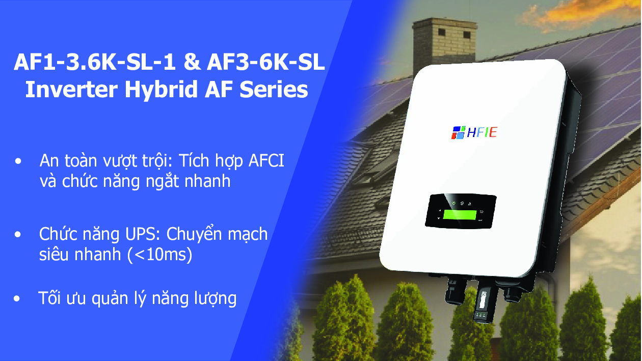 Bộ Inverter Hybrid AF Series mang đến hiệu suất vượt trội, độ ổn định cao và khả năng tích hợp linh hoạt với các hệ thống năng lượng mặt trời hộ gia đình, thương mại và công nghiệp.