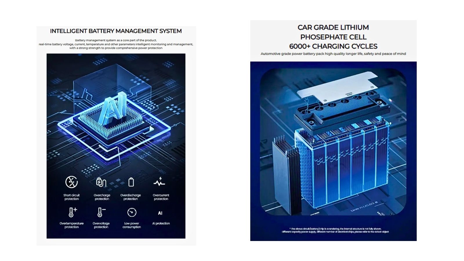 Pin Lithium Lifepo4 mang lại tuổi thọ dài, khả năng sạc xả ổn định và độ an toàn cao. Kèm theo đó là hệ thống BMS thông minh, giúp bảo vệ pin khỏi quá dòng, quá nhiệt, quá sạc và nhiều yếu tố rủi ro khác trong quá trình hoạt động.